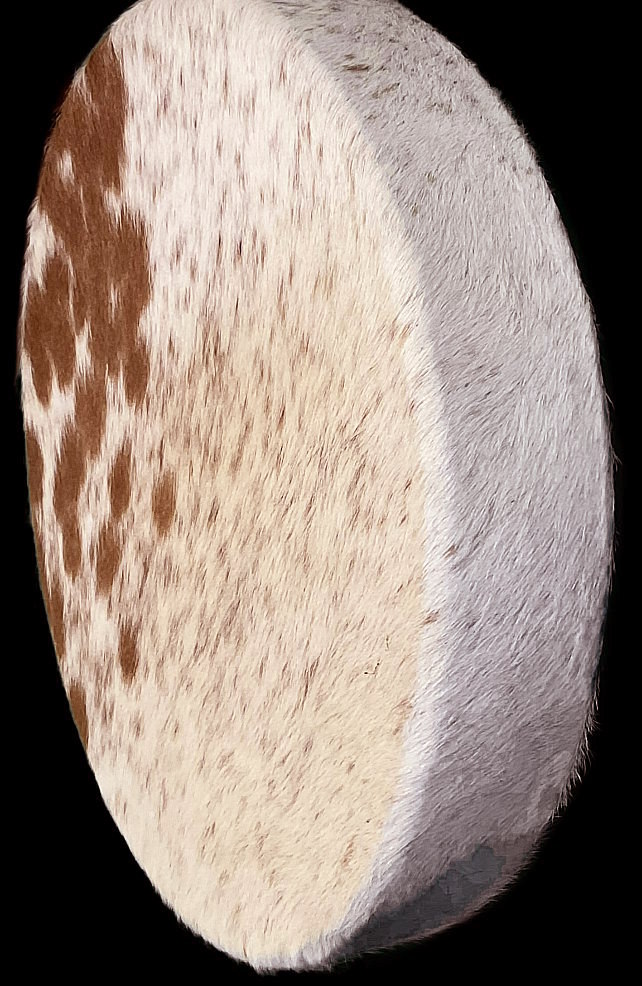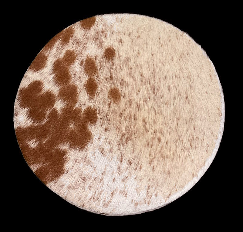 Sa magnifique peau de vachette non rasée, aux nuances naturelles de blanc, de crème et de brun, évoque à la fois la tendresse, l’instinct et la beauté sauvage du vivant.
